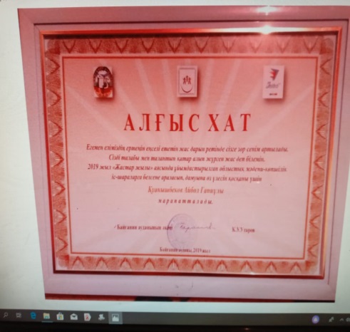 - 2019 ж. - Ақтөбе қаласында өткен «WorldSkills Kazakstan Aktobe-2019» аймақтық чемпионатында «Аспаздық іс» құзіреттілігі бойынша САРАПШЫ қызметін атқарып белсенділік танытқаны үшін «Алғыс хат».